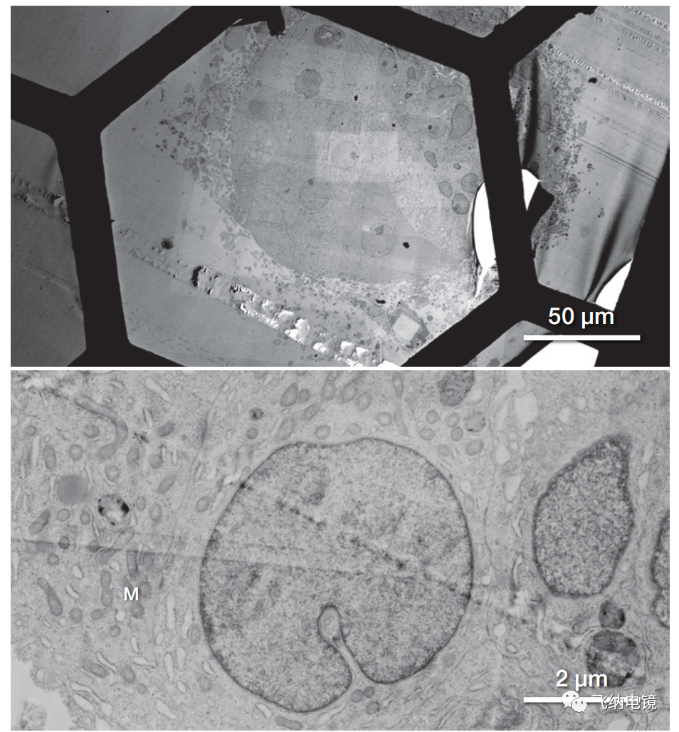 圖 3 人類腦腫瘤組織 STEM 圖。圖中清晰顯示了細胞的超微結(jié)構(gòu)特征,髓鞘軸突、線粒體和嵴結(jié)構(gòu)(M)、包含細胞間質(zhì)纖維和囊泡的星形細胞結(jié)構(gòu)(紅色箭頭處)。圖中可以清晰觀測到細胞結(jié)構(gòu)和細胞器之間的關系。