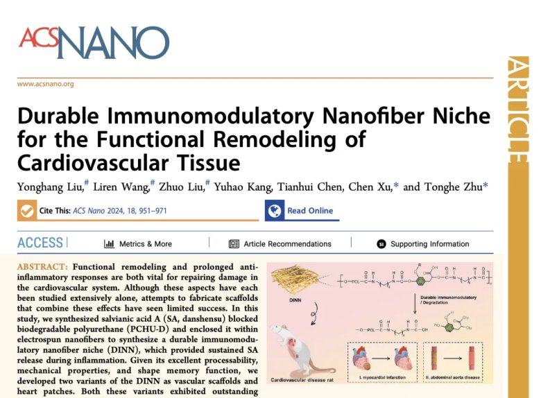 2024 年,上海工程技術(shù)大學(xué)朱同賀教授團(tuán)隊(duì)與復(fù)旦大學(xué)徐晨博士團(tuán)隊(duì)合作,在期刊《ACS Nano》上發(fā)表題為“ Durable Immunomodulatory Nanofiber Niche for the Functional Remodeling of Cardiovascular Tissue”的論文。論文中制備了一種具有長(zhǎng)期免疫調(diào)節(jié)功能的納米纖維生態(tài)位(DINN),可以用于心血管組織修復(fù)和功能重塑。