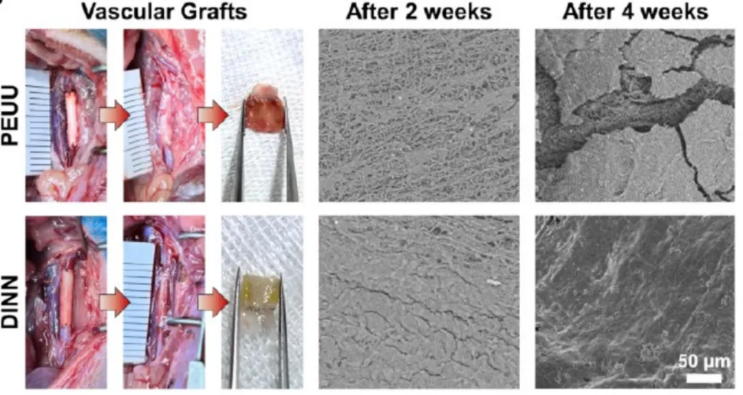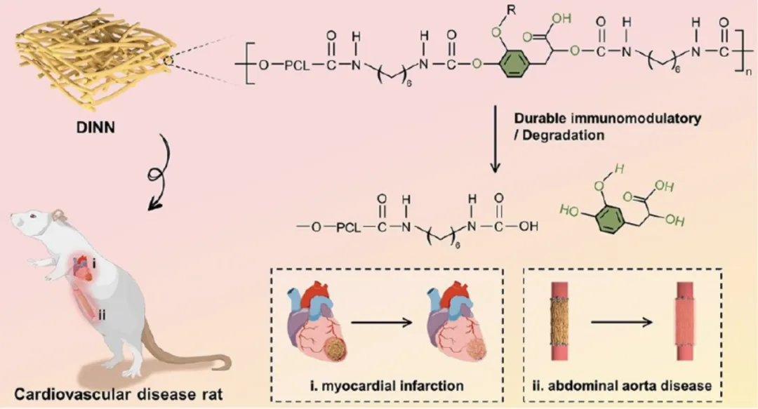 為了解決上述挑戰(zhàn),兩個(gè)團(tuán)隊(duì)合成了可降解聚氨酯彈性體,以 SA 作為擴(kuò)鏈劑。然后將這些彈性體靜電紡絲成納米纖維支架,以產(chǎn)生耐用的免疫調(diào)節(jié)納米纖維微環(huán)境 (DINN)。SA 響應(yīng)周圍的再生微環(huán)境從納米纖維中釋放出來,直到材料完全降解。DINN 在降解過程中表現(xiàn)出穩(wěn)定的機(jī)械性能,證明其適合長(zhǎng)期體內(nèi)植入以治療心血管系統(tǒng)損傷。體外實(shí)驗(yàn)驗(yàn)證了 DINN 的各種作用,例如其持續(xù)的抗炎作用和抑制細(xì)胞凋亡。更重要的是,DINN 可以響應(yīng)炎癥浸潤(rùn)而降解,從而釋放相應(yīng)的 SA。DINN 的生物治療作用在心肌梗死 (MI) 大鼠模型和腹主動(dòng)脈移植中得到進(jìn)一步證實(shí)。研究結(jié)果表明 DINN 可以用于治療心血管組織損傷。