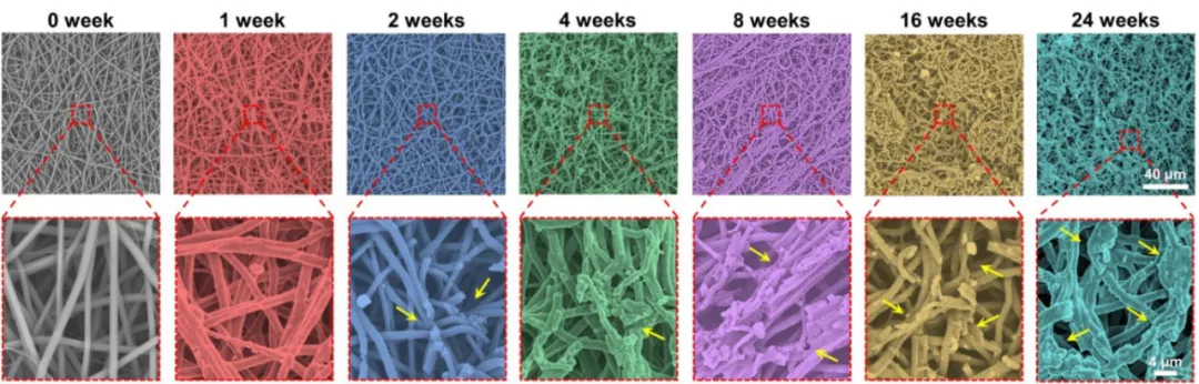 該文章使用 Phenom XL 臺(tái)式掃描電鏡大倉(cāng)室卓越版,用于觀察:(1)靜電紡絲后的DINN 形貌;(2)不同時(shí)間段 DINN 降解后形貌;(3)血液相容性評(píng)估中,測(cè)試 DINN 纖維表面血小板;(4)DINN植入生物體后一段時(shí)間,修復(fù)組織在其表面生長(zhǎng)情況。