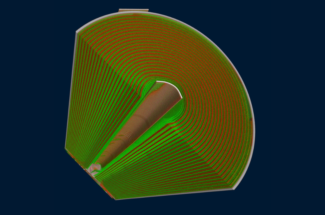 圖1使用 Neoscan N90 高分辨納米CT 以 580nm 體素尺寸掃描鋰電池,內(nèi)部結(jié)構(gòu)得以清晰展示。