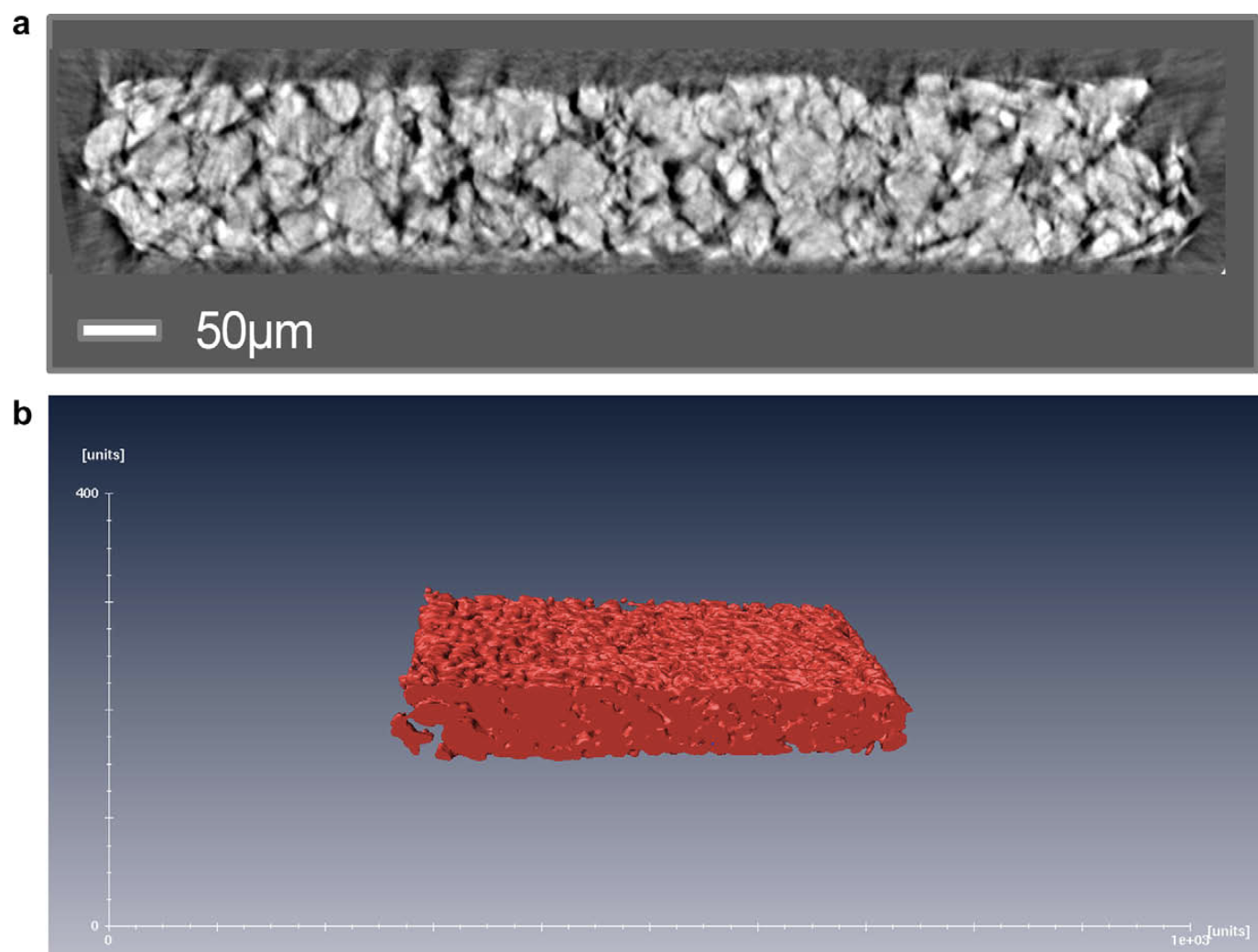 圖3 使用 nano ct 以 480nm 體素尺寸掃描石墨負(fù)極,(a) 來自斷層掃描序列的單個切片。 (b) 300個獨立的斷層掃描切片的渲染圖(尺寸為43 × 348 × 144微米)。圖片來源于文獻【1】