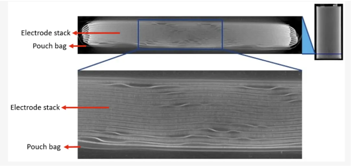 圖4 G1C 軟包電池在化成后但循環(huán)前的 X 射線計算機斷層掃描橫截面。放大視圖以高分辨率拍攝(體素大小為 8.5μm)。右圖表示橫截面(電池底部)的高度。圖片來源于文獻【2】