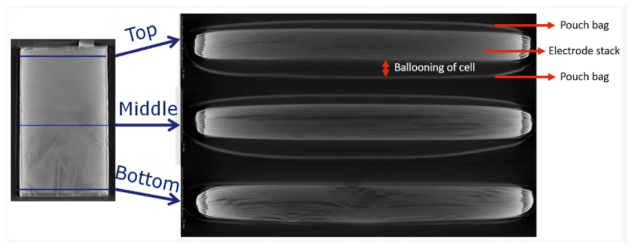 圖5 進行壽命測試(未進行壓縮)后,軟包電池頂部、中部和底部的 X 射線計算機斷層掃描橫截面。膨脹在圖所示的頂部和中間橫截面中清晰可見(參見袋和電極層堆棧之間的暗區(qū))。圖片來源于文獻【2】