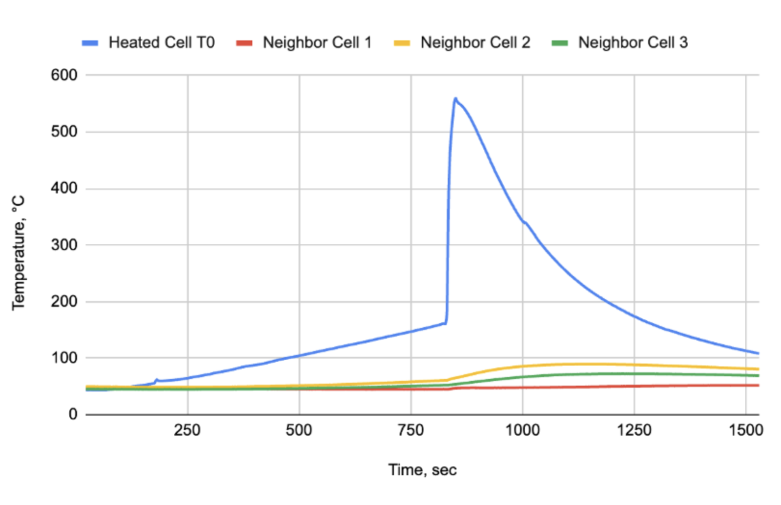 用單電池加熱器引起電池?zé)崾Э夭⑦M(jìn)行測試,ALD涂層處理的電池沒有發(fā)現(xiàn)熱失控溫度條件下的熱傳導(dǎo),這對 Forge Nano 電池配方來說是一個(gè)振奮人心的結(jié)果。在第一次模塊測試中,被推至熱失控的 Forge Nano 電池最高溫度達(dá)到 400°C,而第二次測試最高溫度達(dá)到 550°C。采用 Atomic ArmorTM 涂層材料的 Forge Nano 電池產(chǎn)生的熱量減少可能是消除模塊傳導(dǎo)的一個(gè)因素。需要進(jìn)一步調(diào)查才能得出確切的結(jié)論,這計(jì)劃在未來的模塊構(gòu)建中進(jìn)行。
