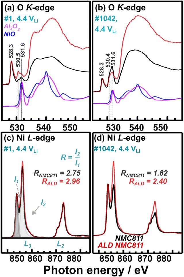 圖.6.(a)和(c)展示了首次充電至4.4 VLi的NMC811(黑色)和ALD NMC811(紅色)電極的O K-edge和Ni L-edge X射線吸收光譜,同時提供了 γ-Al?O?(品紅色)和NiO(藍色)參考樣品的光譜。經過1042次循環后的電化學老化狀態,以及充電至4.4 VLi的材料的O K-edge和Ni L-edge光譜分別在(b)和(d)中展示。對于Ni L-edge,L?高能量(I?,855.8 eV)與低能量(I?,853.7 eV)積分面積的比值用R表示