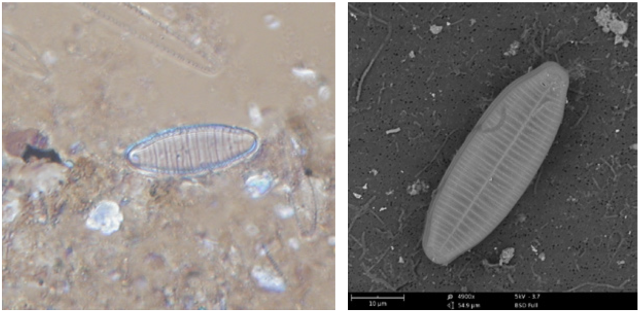 圖2. 另一組對比:光學顯微鏡圖像(左,約2000倍)與掃描電鏡圖像(右,4900倍)的 vulgaris 硅藻。