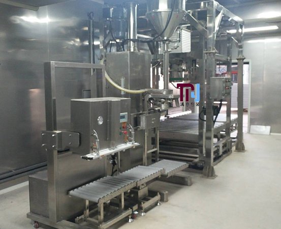 當定量包裝秤進入自動運行狀態后,稱重控制系統打開給料門開始加料,該給料裝置為快、慢兩級給料方式;當物料重量達到快給料設定值時,停止快給料,保持慢給料;當物料重量達到最終設定值時,關閉給料門,完成動態稱重過程;此時系統檢測夾袋裝置是否處于預定狀態,當包裝袋已夾緊后,系統發出控制信號打開稱量斗卸料門,物料進入包裝袋中,物料放完后自動關閉稱量斗的卸料門;卸空物料后松開夾袋裝置,包裝袋自動落下;包裝袋落下后進行縫包并輸送到下一工位。如此循環往復自動運行。