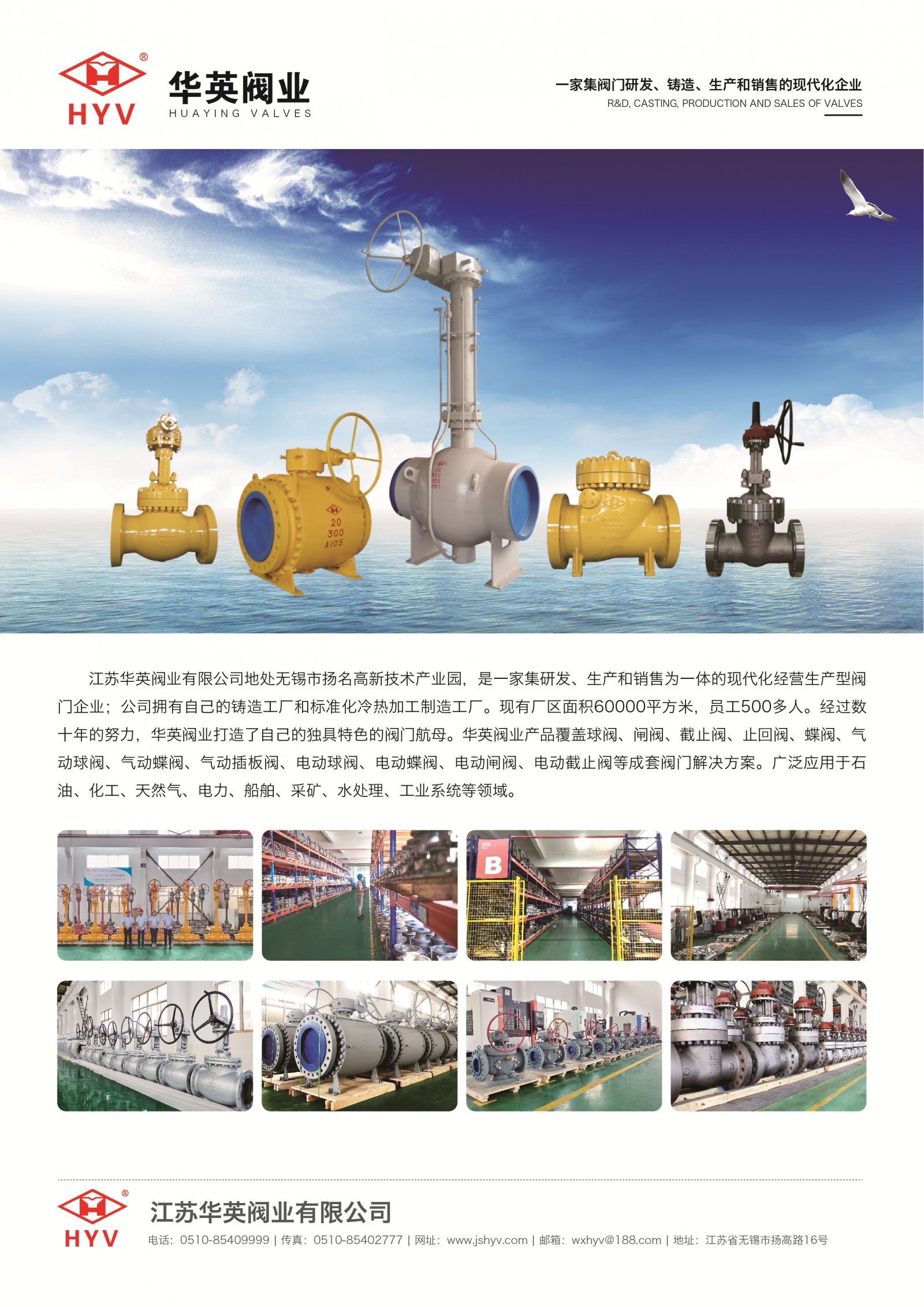 華英閥業總部位于無錫市揚名高新技術產業園,是一家集研發、生產和銷售為一體的現代化經營生產型閥門企業,擁有自己的鑄造工廠和標準化冷熱加工制造工廠?,F有廠區面積60000平方米,員工500多人。華英閥業打造了自己的獨具特色的閥門航母,產品覆蓋球閥、閘閥、截止閥、止回閥、蝶閥、調節閥、氣動球閥、氣動蝶閥、氣動插板閥、電動球閥、電動蝶閥、電動閘閥、電動截止閥等。廣泛應用于石油、化工、天然氣、電力、船舶、采礦、水處理、工業系統等領域。