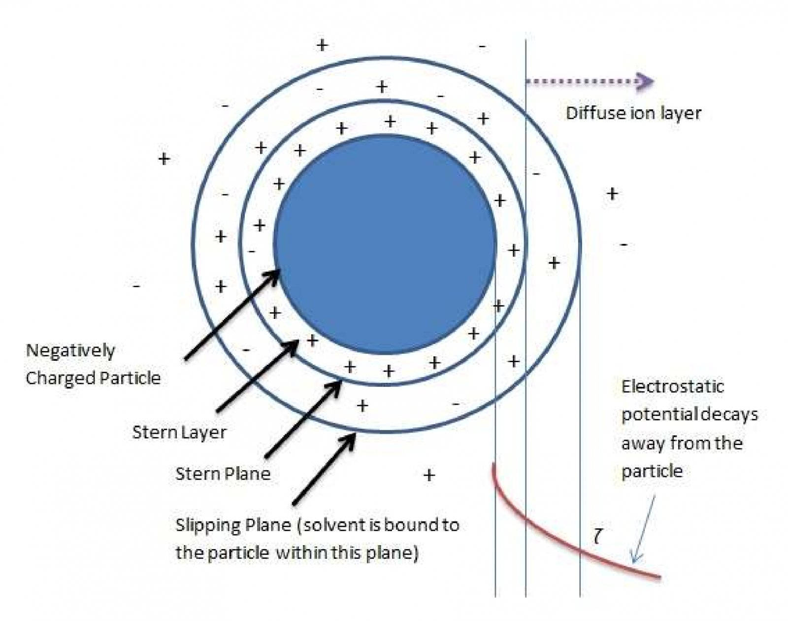由于分散粒子表面帶有電荷而吸引周圍的反號離子,這些反號離子在兩相界面呈擴散狀態分布而形成擴散雙電層。根據Stern雙電層理論可將雙電層分為兩部分,即Stern層和擴散層。Stern層定義為吸附在電極表面的一層離子(IHP or OHP)電荷中心組成的一個平面層,此平面層相對遠離界面的流體中的某點的電位稱為Stern電位。穩定層(Stationary layer) (包括Stern層和滑動面slipping plane以內的部分擴散層) 與擴散層內分散介質(dispersion medium)發生相對移動時的界面是滑動面(slipping plane),該處對遠離界面的流體中的某點的電位稱為Zeta電位或電動電位(ζ-電位)。