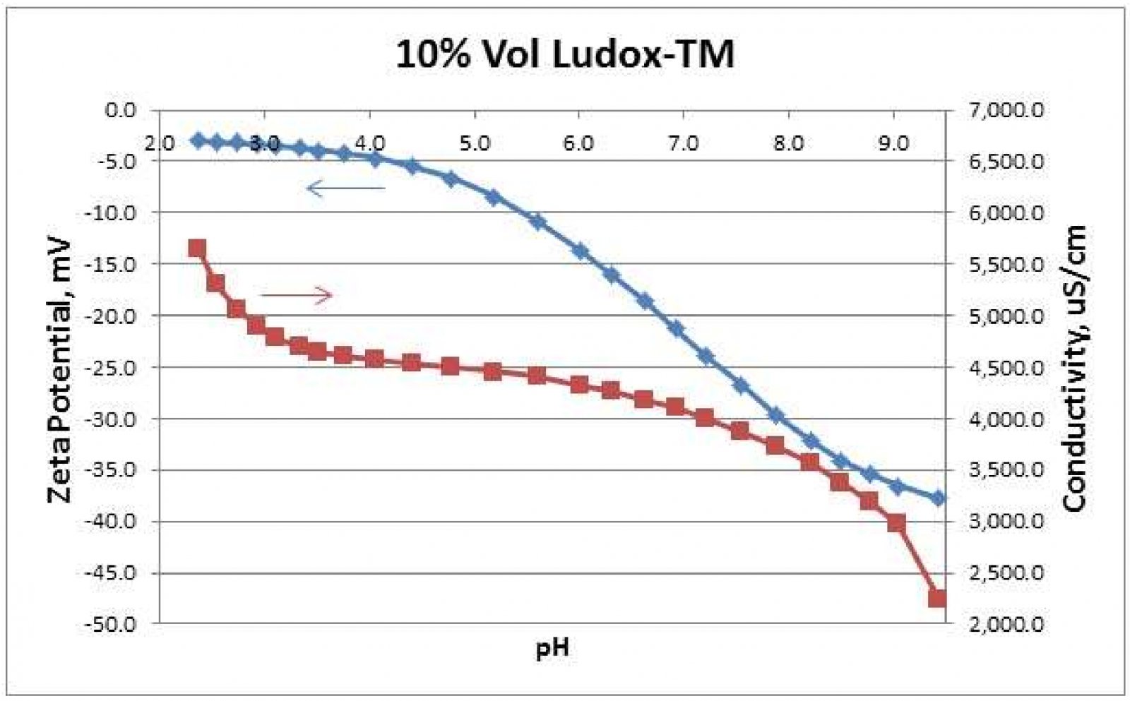 Potentiometric Titrations are useful for determining a sample's IEP. As mentioned above, the IEP may be desirable or otherwise. Potentiometric Titration plots may display plateau regions for Zeta potential vs. pH. Such measurements enable manufacturers to optimize use of acids or bases for transportation and storage. Figure 2 shows a potentiometric titration on a Ludox-TM silica sample by automatic addition of 1N HCl. This titration was performed automatically by a Zeta-APS, Zeta Acoustic Particle Sizer, instrument from Matec Applied Sciences, Northborough, MA USA 3. Figure 2 shows that below pH 4, the Zeta curve approaches a plateau region while Conductivity increases more rapidly. This suggests that the silica particles are becoming saturated with H+ ions as the pH is lowered. Conductivity increases more rapidly as more of these H+ ions stay in the continuous water solvent as opposed to diffusing through the slipping plane toward the particle surface.