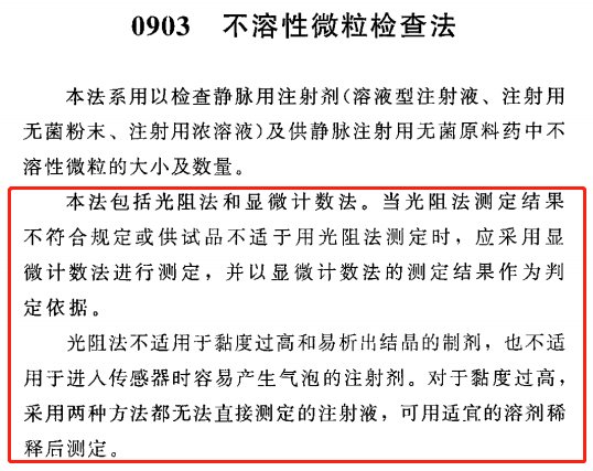 第一:當光阻法測定結果不符合規定或供試品不適于用光阻法測定時,應采用顯微計數法進行測定,并以顯微計數法的測定結果作為判定依據 。