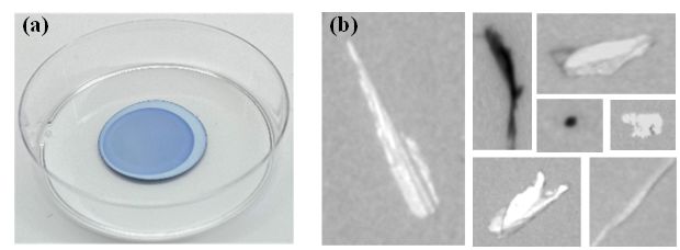 圖3:(a)樣品過濾到濾膜上的實物圖,(b)膜上的典型顆粒圖