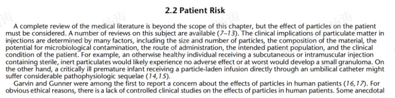不溶性微粒的危害也是為什么要檢測不溶性微粒,根據USP1787的描述,主要是基于安全性的考慮,不溶性微粒會的存在會引起肺部異物栓塞和肉芽腫等安全性的危害。不溶性微粒數量的多少必然會對產品的穩定性和質量產生一定的影響。USP1790章節對于不溶性微粒危害的具體描述如下圖所示: