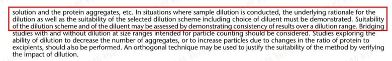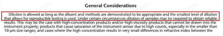 首先無論是中國藥典還是USP都提到,對于一些特殊的樣品都可以進行稀釋之后來進行檢查,那么到底稀釋多少倍,怎么稀釋才是比較合理的,這個是我們經常更加關心的問題。這邊我說點我個人的意見,首先我們一般還是不建議稀釋,如果必須要稀釋是不是可以選擇其他的方法比方說顯微計數法。那么如果要稀釋的話,USP787里面提到一段話大家可以參考,如果選擇稀釋第一要考慮稀釋劑的選擇,稀釋劑和稀釋方案的適用性稀釋結果的一致性來評估,基本的原則就是允許重復性實驗的最小稀釋倍數。所以我們一般不建議稀釋,因為稀釋這個論證的方案是一個讓人頭疼的事情。如果大家有成功的經驗歡迎一起來交流分享,一起學習。