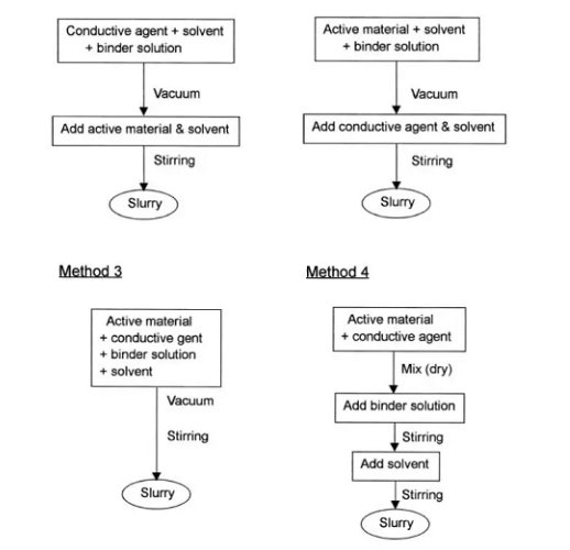 蕞開(kāi)始鋰電池漿料的制造借鑒涂料行業(yè),1999年時(shí),韓國(guó)人就開(kāi)始了研究投料順序?qū){料性質(zhì)和電池性能的影響。他們采取如圖1所示四種投料工藝進(jìn)行混料,采用相同的材料和配方,僅僅改變投料順序就能改變漿料的性質(zhì)。漿料的混合程度取決于顆粒大小,粒度分布,形狀,比表面積,顆粒的溶劑吸收率等,從攪拌開(kāi)始到粘度穩(wěn)定所需的時(shí)間和依次加入的材料的比表面積蕞相關(guān)。