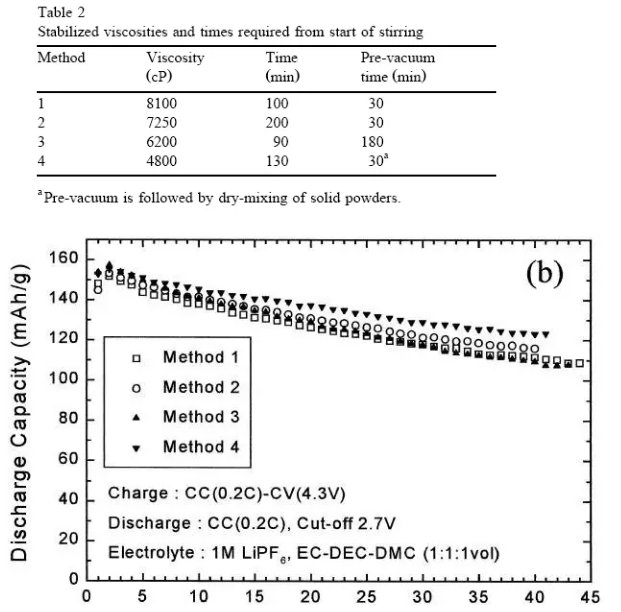 研究結(jié)果發(fā)現(xiàn)采用第4種工藝的漿料粘度達(dá)到穩(wěn)定的時(shí)間可接受,而且所制備的漿料粘度蕞低,如表1所示,分散性蕞好,而且半電池循環(huán)測(cè)試結(jié)果表明此工藝制備的電池循放電容量衰減蕞?。▓D2所示)。