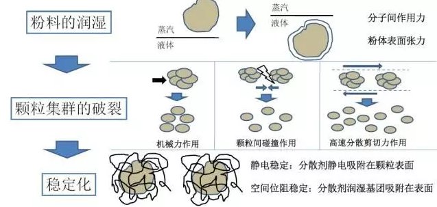 固體粉料在液體中分散基本過(guò)程如圖3所示,分為:(1)粉料的潤(rùn)濕,將附著于粉體上的空氣以液體介質(zhì)取代。一種粉體要分散在液體中,首先被潤(rùn)濕,固體表面的濕潤(rùn)性由其化學(xué)組成和微觀結(jié)構(gòu)決定。固體表面自you能越大,越容易被液體濕潤(rùn);反之亦然,潤(rùn)濕性可用接觸角大小表示。(2)顆粒團(tuán)聚體的破裂、分散,破碎團(tuán)聚體主要有三種力:設(shè)備轉(zhuǎn)動(dòng)過(guò)程中的機(jī)械力,顆粒之間發(fā)生碰撞產(chǎn)生的作用力,高速分散剪切力。(3)固體懸浮物的穩(wěn)定化,阻止已經(jīng)分散的顆粒發(fā)生在團(tuán)聚,分散穩(wěn)定作用有靜電穩(wěn)定、空間位阻穩(wěn)定。