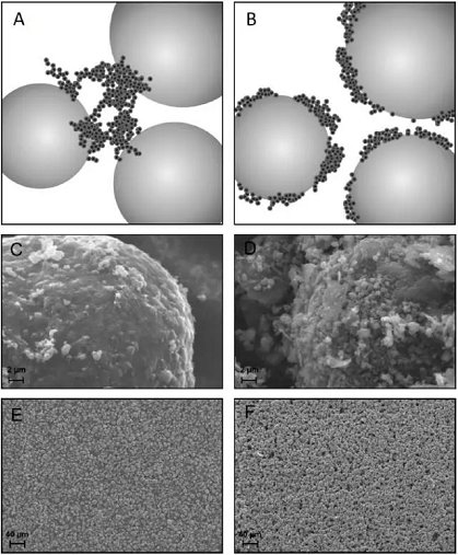 高強(qiáng)度的干粉剪切分散具有兩個(gè)方面的作用:一方面,高的剪切力能夠使導(dǎo)電劑團(tuán)聚體充分破碎分散,另一方面,高速分散作用下,干粉攪拌能夠?qū)崿F(xiàn)微觀上的混合,在較大的活物質(zhì)顆粒表面沉積形成一層由細(xì)小的分散開(kāi)的導(dǎo)電劑沉積層,從而形成良好的導(dǎo)電網(wǎng)絡(luò)。如圖5所示,一般的干粉混合強(qiáng)度低,導(dǎo)電劑沒(méi)有完全分散開(kāi),在活物質(zhì)顆粒表面仍舊存在團(tuán)聚,而高強(qiáng)度干粉混合工藝使導(dǎo)電劑團(tuán)聚體充分破碎分散,在活物質(zhì)表面形成沉積層。