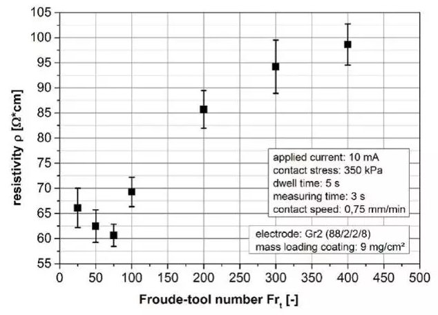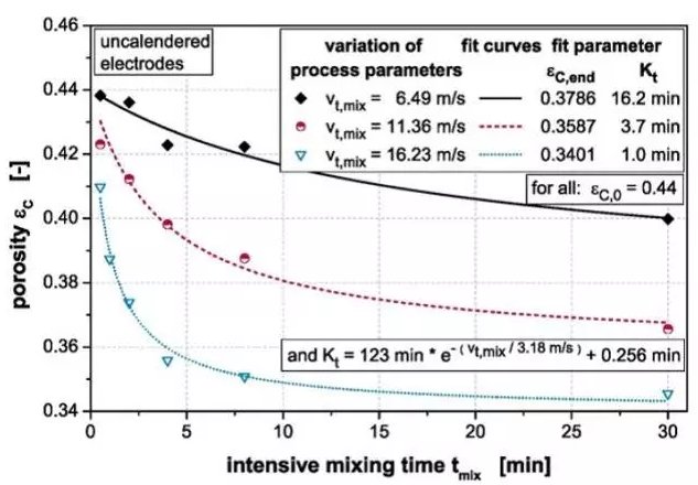 高強(qiáng)度的干粉分散混合主要的參數(shù)有:(1)高速分散的強(qiáng)度,可用弗魯?shù)聰?shù)或轉(zhuǎn)子線速度表示,(2)高速分散的時(shí)間。圖6是高強(qiáng)度干粉混合對(duì)涂布極片孔隙率的影響,極片涂布之后未輥壓,高強(qiáng)度干粉混合能夠降低極片的孔隙率,轉(zhuǎn)速一定時(shí),隨著分散時(shí)間越長(zhǎng),孔隙率越低,而分散時(shí)間一定時(shí),轉(zhuǎn)速越高孔隙率越低。