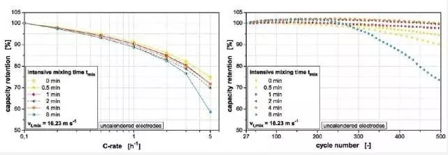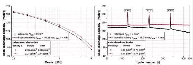 同樣,高強(qiáng)度干粉分散混合,同樣存在合適的工藝范圍,在合適工藝范圍內(nèi),極片和電池性能會(huì)提升,但是超出此范圍,電池性能反而變差。