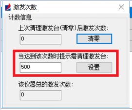 軟件最下方狀態(tài)顯示區(qū)有激發(fā)次數(shù)計數(shù),達到設(shè)定數(shù)值會變紅提示應(yīng)該清理激發(fā)臺,一般建議設(shè)置為500次,也可以根據(jù)實際使用情況設(shè)定,具體方法如下: