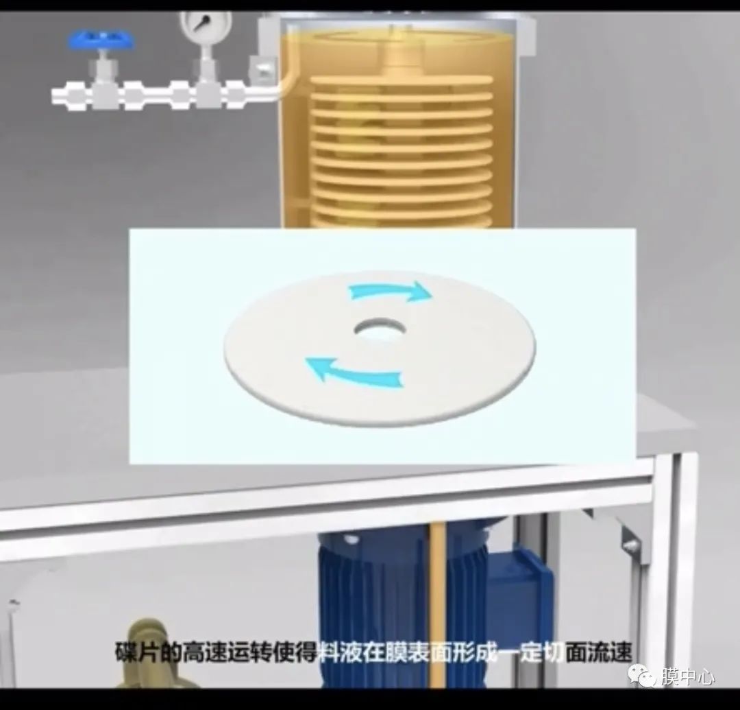 在泵和壓力(2-3kg)的作用下,將高粘度,高 濃度物料打進(jìn)膜組件做高速旋轉(zhuǎn)運(yùn)動(dòng),濾液以 切線方式,在壓力作用下穿過膜孔,通過中空 軸流出。而濃縮物(固形物)由于高速旋轉(zhuǎn)形 成湍流,不斷沖刷膜片表面,防止固形物停留 在膜盤表面,從而有效的防止了膜表面污堵, 保證過濾正常進(jìn)行,從而起到濃縮作用。