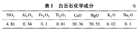 實驗原料為工業級白云石,純度94.68% ,粒徑小于2 m的微粒占10% , 由青島某公司提供,主要化學成分分析見表1。