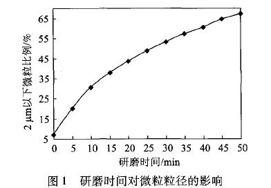 濕法研磨過程中,隨顆粒尺寸的減小,其相互之間的引力增大,致使產生團聚,礦漿黏度也隨之提高。因此,在研磨時,加入分散劑有助于改善粉體的分散穩定性和流動性,防止同質顆粒之間出現團聚,降低礦漿黏度,改善研磨效率¨ 。微粒粒徑與分散