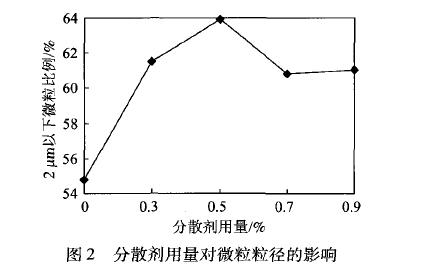 由圖2可知,隨分散劑用量的增加,2 m以下微粒所占的比例先是迅速增加,而后開始降低;在分散劑用量為0.5% 時,其達到最大值(63.9%)。這是因為隨六偏磷酸鈉用量的增加,微粒表面的電荷密度升高,粒子之問的斥力相應增大,使得體系的分散