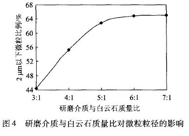 由圖4可以看出,粒徑小于2 m的微粒比例隨研磨介質與白云石質量比的增加而快速增大;質量比為3:1時,微粒粒徑在2 m以下所占比例比較低,僅為44.4% ,表明轉子的能量不能有效地作用于白云石微粒上,造成“空研” 現象嚴重¨ ;隨研磨介