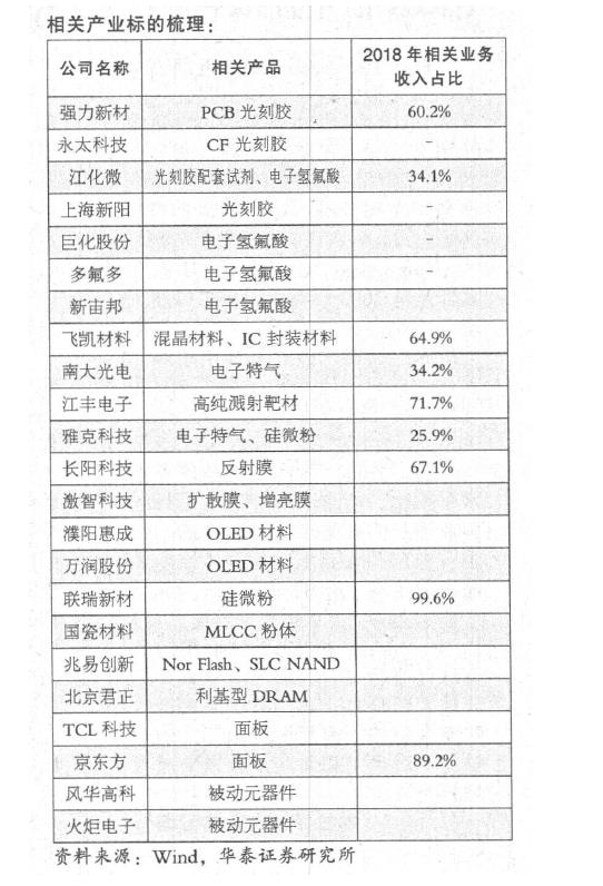 疫情沖擊可能導致半導體材料進口替代。2018 年日韓在半導體原材料產(chǎn)業(yè)鏈市場份額較高的產(chǎn)品包括:硅片(63%)、光刻膠(72%)、掩膜版(60%)、電子級氫氟酸(93%)、濺射靶材(50%)、硅微粉(90%)、MLCC 粉體(>50%)。如果疫情造成產(chǎn)能沖擊,日本優(yōu)先保障高端光刻膠供應,強力新材、上海新陽、永太科技等公司將受到影響;在中低端8 寸硅片領域,中環(huán)股份等公司將受到影響;在電子級氫氟酸領域,巨化股份、多氟多等公司將受到影響;此外,受到影響的還有飛凱材料(混晶材料、IC 封裝材料等)、南大光電(電子特氣)、江豐電子(高純?yōu)R射靶材)、雅克科技(電子特氣、硅微粉)等半導體材料相關公司。