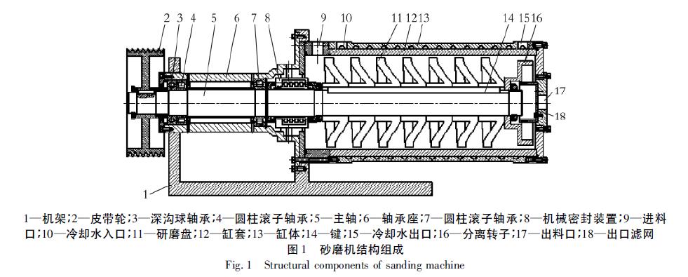 在機架1 上,缸體和缸套之間的螺旋槽兩端分別與冷卻水入口10 和冷卻水出口15 連通,形成缸體冷卻水通道。主軸5 左端通過平鍵與皮帶輪2 連接,由圓螺母軸向定位,主軸5 右端通過平鍵與7 個研磨盤11連接,通過分離轉(zhuǎn)子16,由圓螺母軸向定位,其中的7個研磨盤自左至右是改進前端面垂直軸線的研磨盤、改進后端面帶傾角的研磨盤交替安裝。出口濾網(wǎng)18靠螺釘固定在右缸蓋上,機械密封裝置8 把缸套12的工作腔與軸承座6 的潤滑腔隔開。