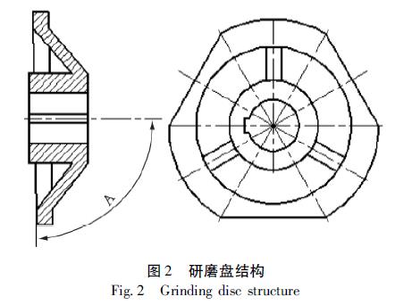 由圖2 可見,研磨盤左端面與軸線方向成確定的夾角A,研磨盤旋轉(zhuǎn)時,產(chǎn)生軸向力使固-液相混合物料軸向移動,碰到左端面與軸線方向垂直的相鄰研磨盤阻擋時反彈,在兩研磨盤間震蕩,加強砂磨效果。