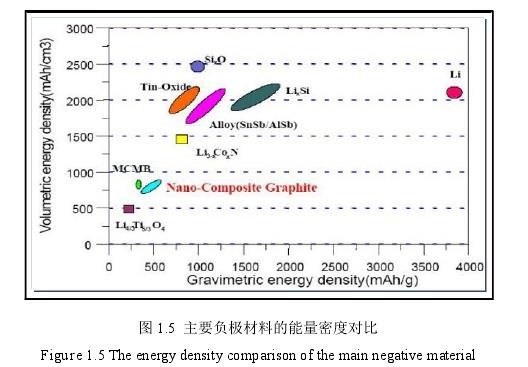 在 20 世紀 80 年代,科研人員進行了很多研究尋找替代材料來解決這些問題鋰離子電池的負極材料需要在體系中具有較低的氧化還原電位以確保電池較高的開路電壓,并且需要保證可以進行可逆脫出嵌入鋰離子,與此同時負極材料的結構變化要小。此外,為了獲得高輸出功率的鋰電池,負極材料具有優異的電子導電性和離子導電性也是非常有必要的。目前鋰離子電池負極活性材料主要分為碳基材料和非碳材料兩大類,在非碳材料中又包括合金材料和金屬及其氧化物等[24-26]。圖 1.5 顯示了主要負極材料的能量密度。實驗研究發現使用碳基材料作為鋰離子電池的負極活性材料可以使 Li+嵌入負極時維持穩定狀態,并且有助于解決鋰金屬作為負極活性材料時產生的安全問題[23]。而且 Li+連續反復嵌入和脫出碳基負極時,碳基材料的晶體結構并不會發生明顯變化,這樣反復的充放電反應可以持續進行并且不產生安全問題。除此之外,對碳基材料的進一步修飾還可以提高鋰離子電池的性能,獲得更高的儲能容量和輸出功率,因此碳基材料成為鋰離子電池最主要的負極材料。