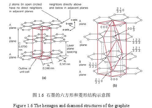 石墨存在兩種晶體結構,六方形結構和菱形結構,六方形結構為 ABABAB堆積方式,菱方結構則為 ABCABCABC 堆積方式,具體結構如圖 1.6 所示[28,29]。