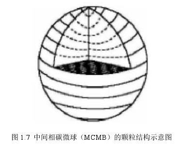 石墨顆粒的重新設計,可以得到具有與石墨不同性質的材料。比較典型的例如中間相碳微球(MCMB)就是一個例子。當瀝青、石油焦之類的原材料經過400℃的加熱,就會生成具有各向異性的球形顆粒,這是因為多環芳香烴化合物的平面分子在經過熱分解和縮合反應后會向一個方向進行堆積形成層狀結構(如圖 1.7 所示)[31]。