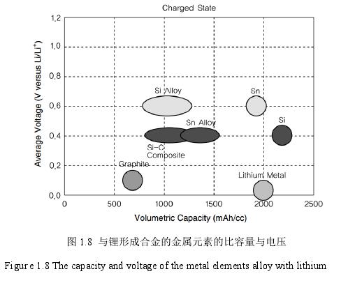 圖 1.8 展示了各種與鋰形成合金的材料的電壓和比容量之間的關系[35]。因為包含硅元素的金屬及合金材料的電壓會比石墨等碳基材料更高,這會導致鋰離子電池的電壓降低,因此 Si 等負極材料在實際應用中的能量密度會比預期小,這些在設計電池時要考慮到。
