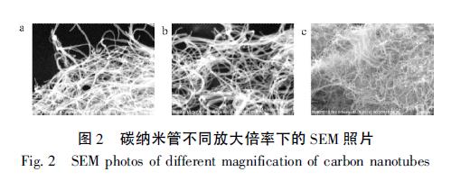通過采用XRD 測試分析了碳納米管晶體結構,如圖1 所示。通過SEM 測試( 圖2) ,在不同放大倍率( 50. 0 k、60. 0 k、35. 0 k) 下,可以看出碳納米管生長分布均勻,直徑在30 ~60 nm,長徑比適中的碳納米管可以有效地與活性物質硫相結合,在反應過程中可以有效地抑制多硫化物的“穿梭效應”。