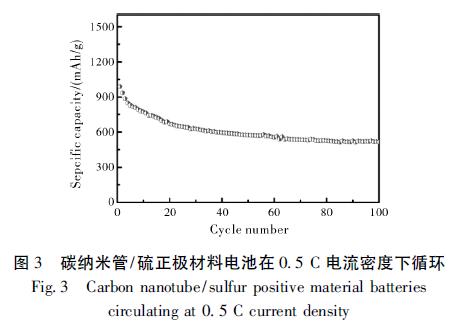 為了進一步驗證改善后的碳納米管/硫復合材料的循環性能,對碳納米管/硫復合材料進行相應電化學測試,如圖3 所示,在0. 5 C 電流密度下,首次放電容量為980 mAh /g,循環100 圈后,容量為586 mAh /g,從循環性能上看,該材料所制備電池穩定性良好。