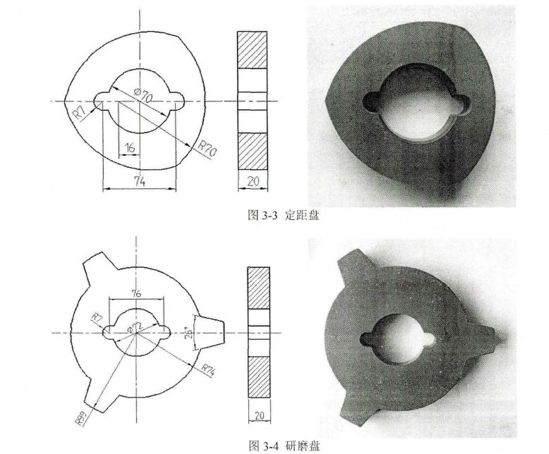 為了提高研磨時的攪拌效果,將規(guī)則的圓形盤片加工成帶有三個爪的盤片,可提高研磨盤的攪拌力度,尺寸設(shè)計如下圖。其次,研磨盤片中間的定距盤片雖然對研磨的作用較小,但是也起到一定的作用,若將其結(jié)構(gòu)也做一些改進,亦可提高砂磨機的研磨效