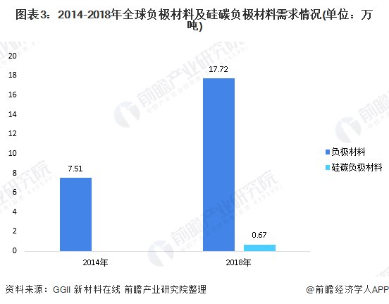 圖表3:2014-2018年全球負(fù)極材料及硅碳負(fù)極材料需求情況(單位:萬(wàn)噸)