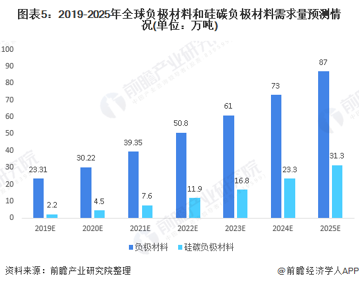 預(yù)計(jì)2025年硅碳負(fù)極材料滲透率將達(dá)到36%左右,而根據(jù)中國(guó)物理與化學(xué)行業(yè)協(xié)會(huì)預(yù)測(cè),2020-2022年全球負(fù)極材料需求將分別達(dá)到30.22萬(wàn)噸、39.35萬(wàn)噸、50.80萬(wàn)噸,年復(fù)合增長(zhǎng)率為29.65%。前瞻在此基礎(chǔ)上預(yù)計(jì)2023-2025年隨著負(fù)極材料下游需求領(lǐng)域發(fā)展的放緩,預(yù)計(jì)2025年全球負(fù)極材料需求將達(dá)到87萬(wàn)噸左右。按照這一數(shù)據(jù)以及前文對(duì)全球硅碳負(fù)極材料滲透率的預(yù)測(cè),2025年全球硅碳負(fù)極材料需求量將達(dá)到31萬(wàn)噸左右。