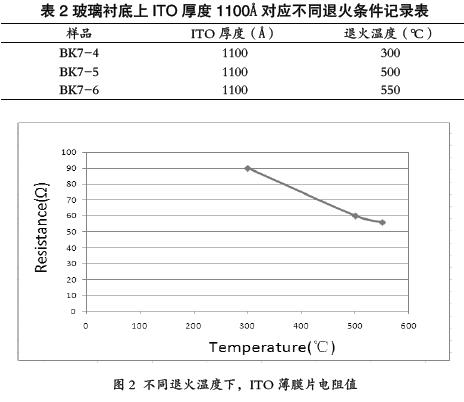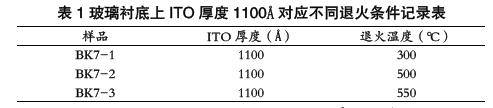表1 是BK7 玻璃襯底上蒸鍍ITO 厚度1100?, 分別在300℃、500℃、550℃條件下退火的記錄表,蒸鍍條件為:腔體真空度5.6×106Pa,蒸鍍溫度為310℃,鍍膜速率為1?/s,氧氣流量為10sccm。