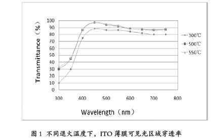 當退火溫度較低時,ITO 薄膜內部原子沒有獲得足夠的能量進行擴散,結晶質量不好,無法修復內部缺陷,對光子吸收嚴重,當溫度達到500℃以上,能提供足夠的能量讓ITO 原子重新排列,重結晶,大量缺陷被修復,薄膜穿透率上升可達