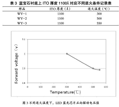 表三是在玻璃襯底上蒸鍍ITO 厚度1100?, 分別在300℃、500℃、550℃條件下退火的記錄表,蒸鍍條件為:腔體真空度5.6×106Pa,蒸鍍溫度為310℃,鍍膜速率為1?/s,氧氣流量為10sccm。蒸鍍完ITO 后,按照芯片加工工藝,鍍膜、光刻、去膠、清洗、等步驟完成LED 芯片的制作,制作成單顆尺寸18mi*35mil 的芯片,然后測試LED 芯片在150MA 下的正向工作電壓VF 和發光亮度LOP。
