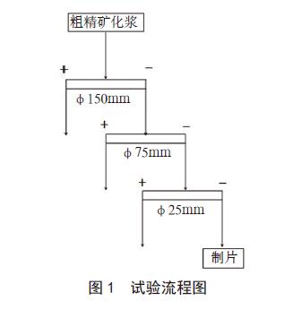 首先將粗精礦化漿,礦漿濃度控制在16% 左右,然后依次采用φ150mm、φ75mm、φ25mm 水力旋流器分選,壓濾出φ25mm 溢流干礦。接著對其進行化漿,加入適量分散劑,礦漿濃度控制在45% 左右,最后采用砂磨機進行剝片,試驗流程見圖1。