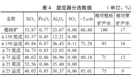 在表2 的工作參數下,旋流器分選數據見表4。分析表4 可知:φ150mm、φ75mm、φ25mm 水力旋流器對粗精礦起到了很好的分選作用,鋁含量從33.67% 提升到了38.37%,-2μm 粒度從68.80%提升到了85.01%。