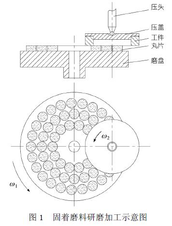 固著磨料高速研磨是將散粒的磨料固結(jié)起來,制成專用磨具, 在高速研磨機上對工件進行高速研磨的方法. 所用的專用磨具是根據(jù)工件的要求,用不同的磨料制成丸片, 再將丸片粘結(jié)到磨盤上,制成不同形狀的磨具, 其構(gòu)造如圖1 所示.固著磨料高速研磨與傳統(tǒng)的散粒磨料慢速研磨相比具有以下優(yōu)點[1~4]: