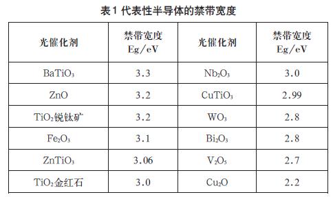 半導體光催化的原理如下: 用光照射半導體,當照射光光子的能量等于或高于半導體的帶隙能量時,半導體的價帶電子就可吸收光子的能量并躍遷到導帶,同時產生光生電子-空穴對,快速遷移到半導體表面的空穴和光生電子分別與吸附在半導體表面的氧分子和水分子作用,產生具有強氧化作用的活性氧和羥基,并與其接觸的化學物質發生氧化還原反應,使有毒有害物質降解,轉化為無毒無害物質。半導體的禁帶寬度決定了光催化劑的激發波長。禁帶越寬,所需要的激發光光子能量越大,光波波長越短;反之,禁帶越窄,所需要的激發光波長越長。表1 為一些代表性半導體的禁帶寬度。